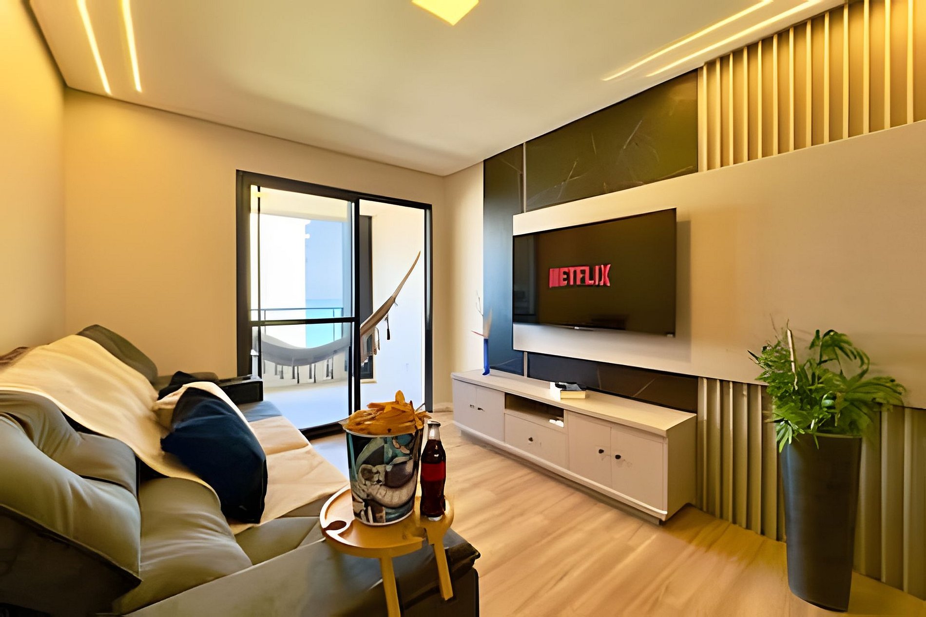 Todos os dormitórios são climatizados, varanda com rede e churrasqueira e cozinha completa para você se sentir em casa.