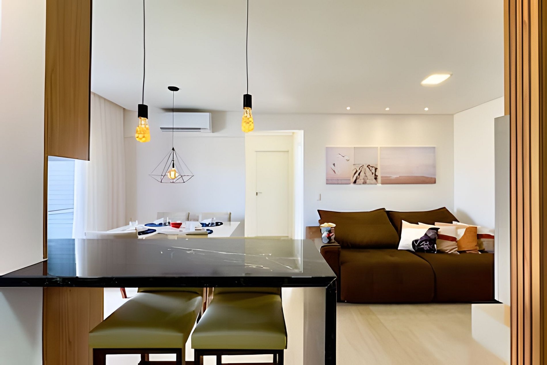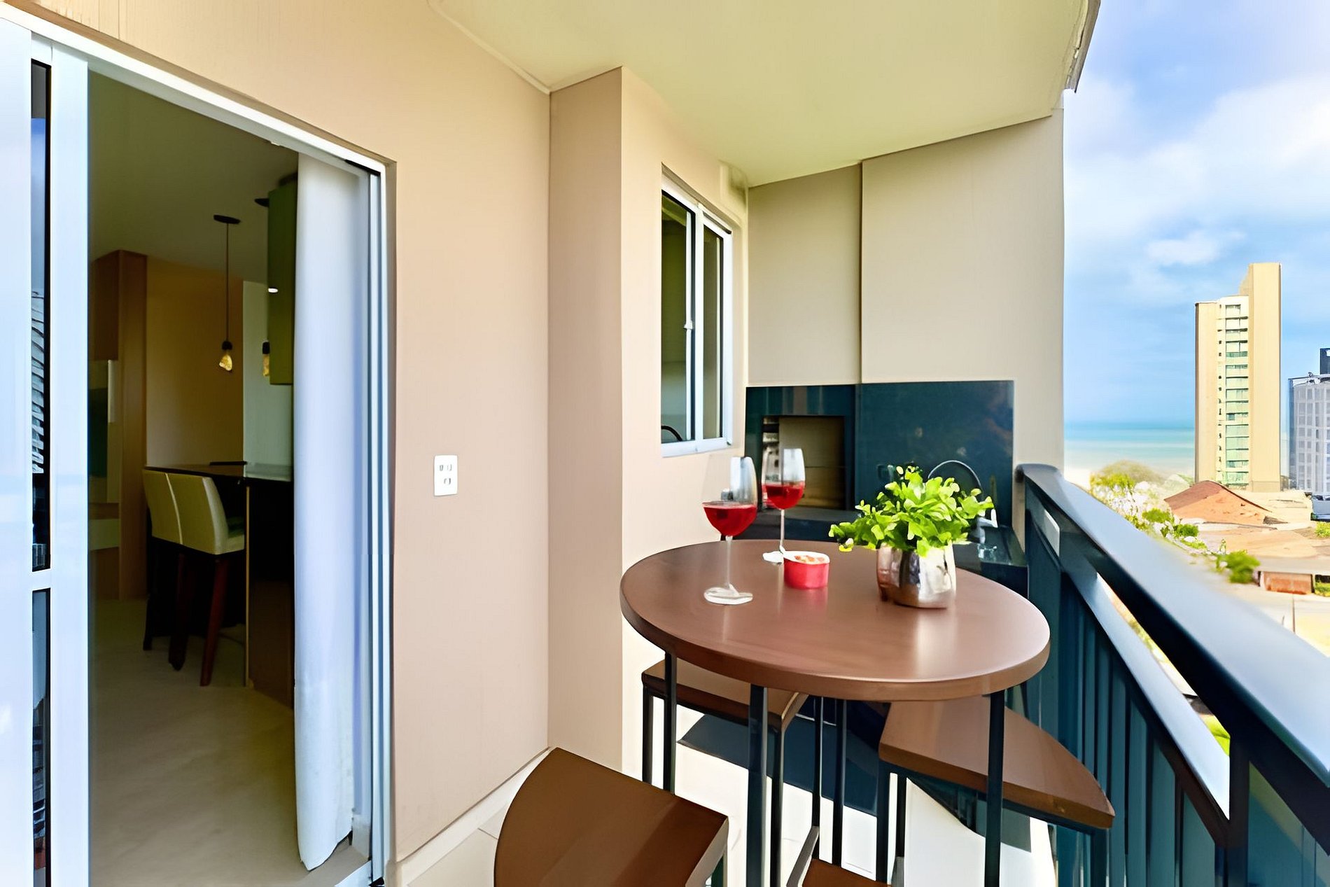 Destaques do apartamento - Acomoda até 5 pessoas com conforto - Vista lateral do mar a partir da sacada - Ambientes integrados e climatizados - Wi-Fi de alta velocidade - Cozinha completa com utensílios e eletrodomésticos modernos - Sacada com churrasqueira privativa - Smart TV e sala ampla com sofá aconchegante